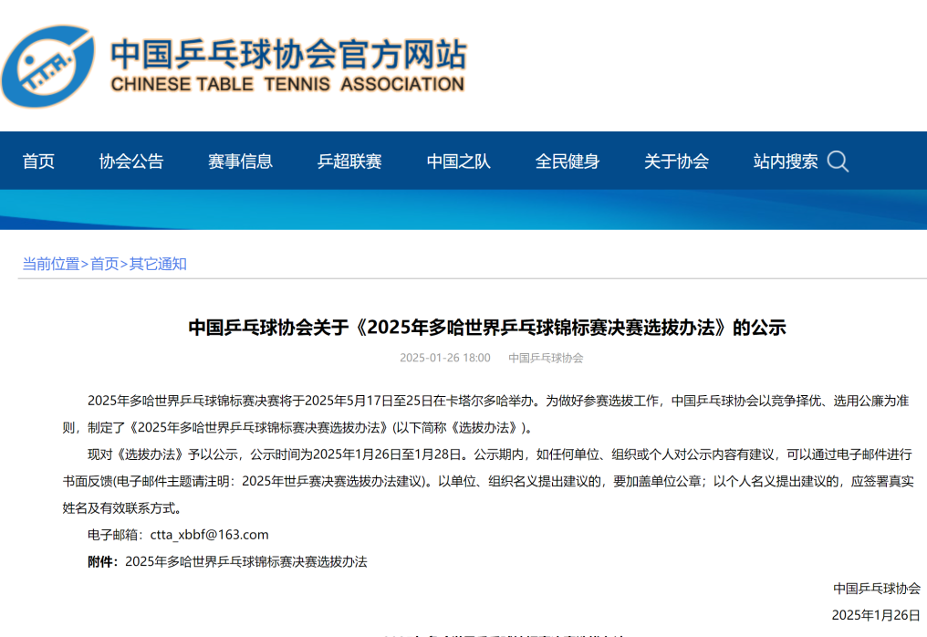 新華社北京1月26日電 中國(guó)乒協(xié)26日在官網(wǎng)公示了《2025年多哈世界乒乓球錦標(biāo)賽決賽選拔辦法》(以下簡(jiǎn)稱《選拔辦法》)。