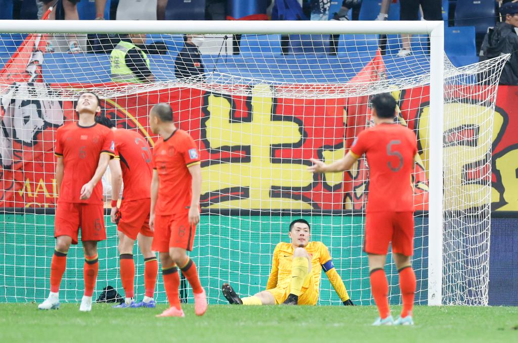 2024年9月10日,中國(guó)隊(duì)守門(mén)員王大雷(下)在球隊(duì)失球后。當(dāng)日,中國(guó)隊(duì)主場(chǎng)1比2不敵沙特隊(duì)。新華社記者 曹燦 攝
