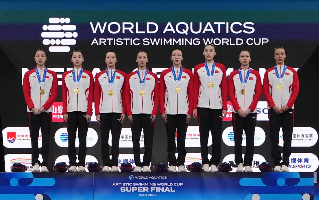 冠軍中國(guó)隊(duì)在集體技巧自選決賽頒獎(jiǎng)儀式上。15日,在2025年花樣游泳世界杯總決賽集體技巧自選決賽中,中國(guó)隊(duì)獲得冠軍。新華社記者 李一博 攝