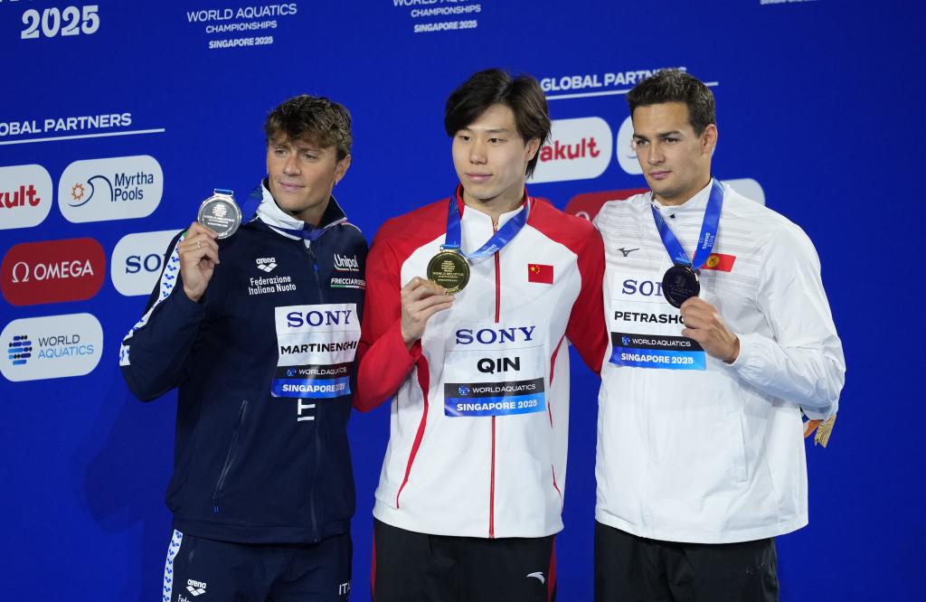 男子50米蝶泳決賽,法國(guó)選手格魯塞獲得金牌,瑞士選手蓬蒂和意大利選手切孔分獲銀牌和銅牌。