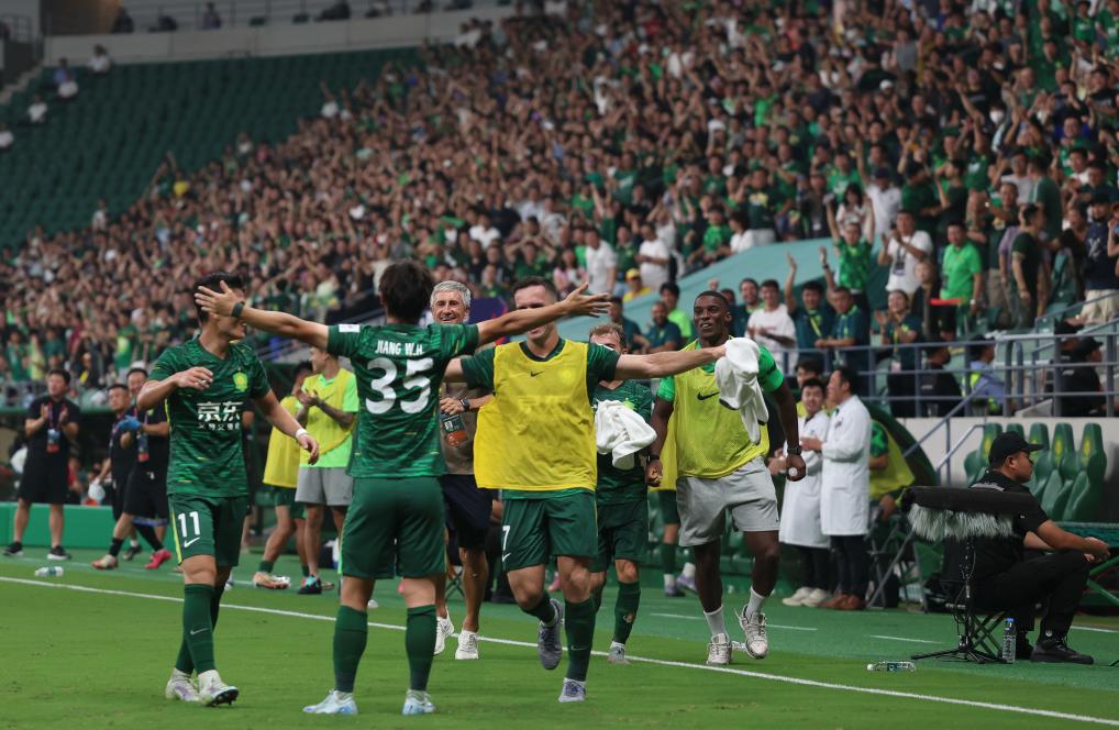 8月20日,北京國安隊球員江文豪(左二)在比賽中進球后慶祝。新華社記者 胡星宇 攝