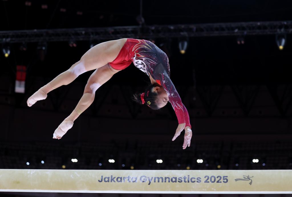 10月25日,中國(guó)選手張清穎在2025年國(guó)際體操聯(lián)合會(huì)(FIG)競(jìng)技體操世錦賽女子平衡木決賽中奪得冠軍。新華社記者 白雪飛 攝
