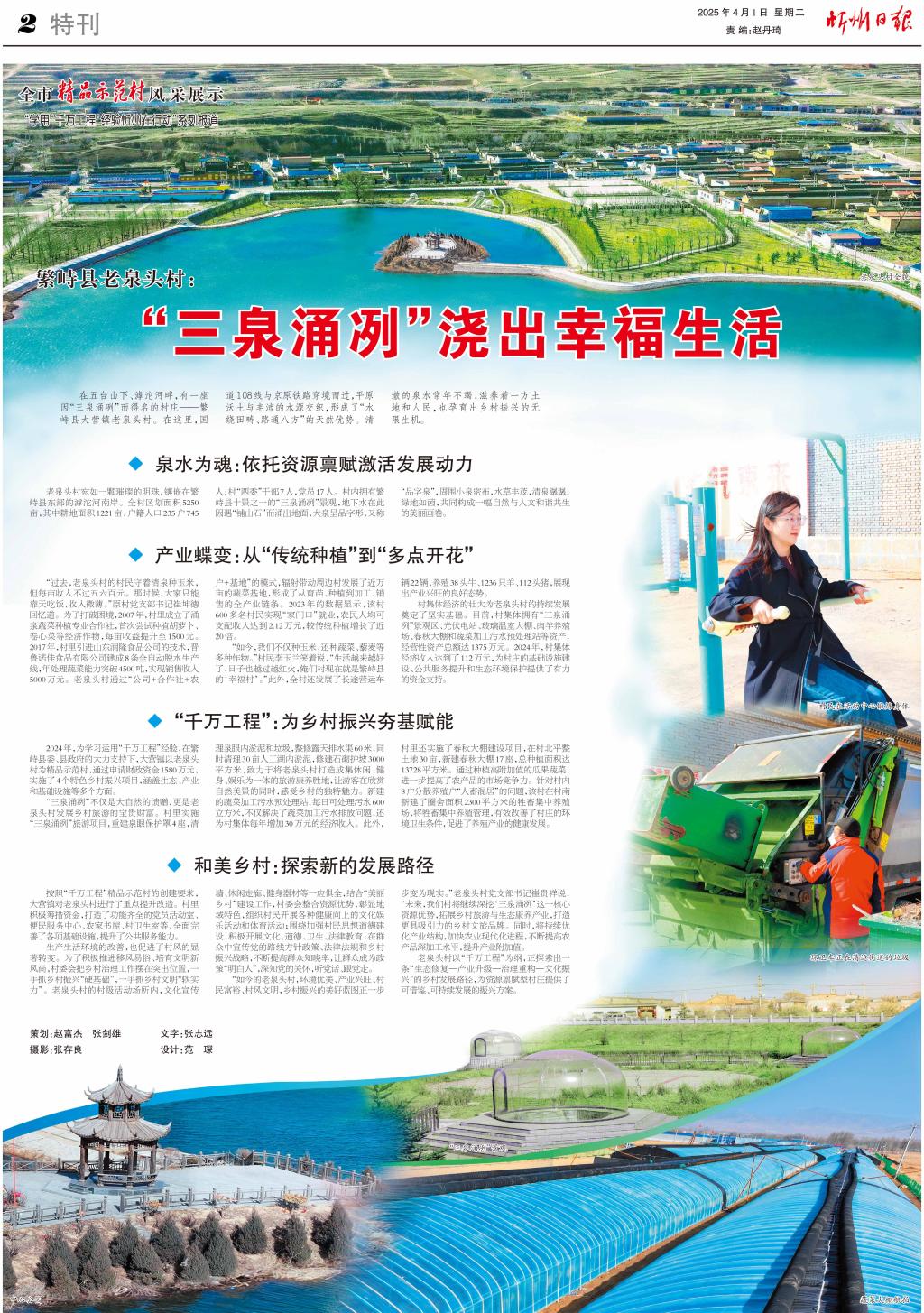 “如今的老泉頭村,環(huán)境優(yōu)美、產(chǎn)業(yè)興旺、村民富裕、村風(fēng)文明,鄉(xiāng)村振興的美好藍(lán)圖正一步步變?yōu)楝F(xiàn)實(shí)。”老泉頭村黨支部書記崔貴祥說,“未來,我們村將繼續(xù)深挖‘三泉涌冽’這一核心資源優(yōu)勢(shì),拓展鄉(xiāng)村旅游與生態(tài)康養(yǎng)產(chǎn)業(yè),打造更具吸引力的鄉(xiāng)村文旅品牌。同時(shí),將持續(xù)優(yōu)化產(chǎn)業(yè)結(jié)構(gòu),加快農(nóng)業(yè)現(xiàn)代化進(jìn)程,不斷提高農(nóng)產(chǎn)品深加工水平,提升產(chǎn)業(yè)附加值。