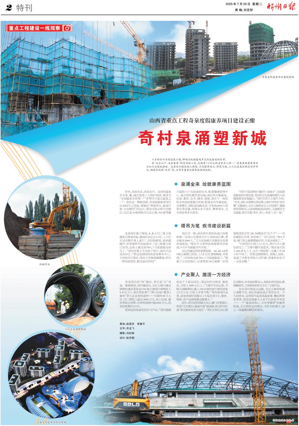 在“五臺(tái)山下、自在康養(yǎng)”的奇村核心區(qū),總投資7.5億元的省重點(diǎn)工程——奇泉度假康養(yǎng)項(xiàng)目正如火如荼地推進(jìn)。記者近日探訪施工現(xiàn)場(chǎng),只見塔吊林立、焊花飛濺,工人們?cè)谀媳眱蓞^(qū)同步作業(yè),鋼筋水泥的“生長(zhǎng)”里,正孕育著晉北康養(yǎng)旅游新地標(biāo)。