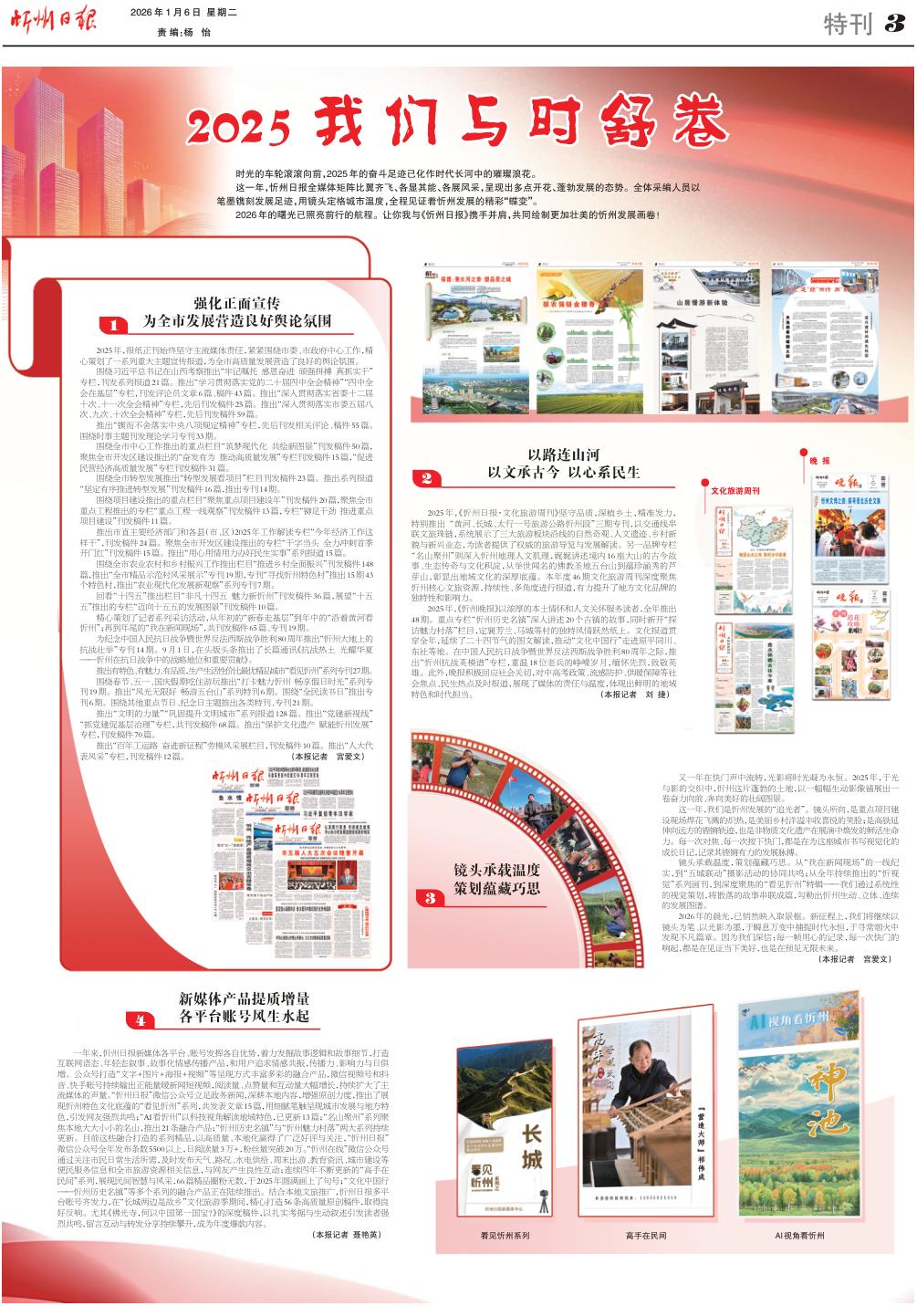 時(shí)光的車(chē)輪滾滾向前,2025年的奮斗足跡已化作時(shí)代長(zhǎng)河中的璀璨浪花。 這一年,忻州日?qǐng)?bào)全媒體矩陣比翼齊飛、各顯其能、各展風(fēng)采,呈現(xiàn)出多點(diǎn)開(kāi)花、蓬勃發(fā)展的態(tài)勢(shì)。全體采編人員以筆墨鐫刻發(fā)展足跡,用鏡頭定格城市溫度,全程見(jiàn)證著忻州發(fā)展的精彩“蝶變”。 2026年的曙光已照亮前行的航程。讓你我與《忻州日?qǐng)?bào)》攜手并肩,共同繪制更加壯美的忻州發(fā)展畫(huà)卷! 1、強(qiáng)化正面宣傳 為全市發(fā)展?fàn)I造良好輿論氛圍 2025年,報(bào)紙正刊始終堅(jiān)守主流媒體責(zé)任,緊緊圍繞市委、市政府中心工作,精心策劃了一系列重大主題宣傳報(bào)道,為全市高質(zhì)量發(fā)展?fàn)I造了良好的輿論氛圍。 圍繞習(xí)近平總書(shū)記在山西考察推出“牢記囑托感恩奮進(jìn)頑強(qiáng)拼搏真抓實(shí)干”專(zhuān)欄,刊發(fā)系列報(bào)道21篇。推出“學(xué)習(xí)貫徹落實(shí)黨的二十屆四中全會(huì)精神”“四中全會(huì)在基層”專(zhuān)欄,刊發(fā)評(píng)論員文章6篇、稿件43篇。推出“深入貫徹落實(shí)省委十二屆十次、十一次全會(huì)精神”專(zhuān)欄,先后刊發(fā)稿件25篇。推出“深入貫徹落實(shí)市委五屆八次、九次、十次全會(huì)精神”專(zhuān)欄,先后刊發(fā)稿件59篇。 推出“鍥而不舍落實(shí)中央八項(xiàng)規(guī)定精神”專(zhuān)欄,先后刊發(fā)相關(guān)評(píng)論、稿件55篇。圍繞時(shí)事主題刊發(fā)理論學(xué)習(xí)專(zhuān)刊33期。 圍繞全市中心工作推出的重點(diǎn)欄目“筑夢(mèng)現(xiàn)代化共繪新圖景”刊發(fā)稿件50篇,聚焦全市開(kāi)發(fā)區(qū)建設(shè)推出的“奮發(fā)有為推動(dòng)高質(zhì)量發(fā)展”專(zhuān)欄刊發(fā)稿件15篇,“促進(jìn)民營(yíng)經(jīng)濟(jì)高質(zhì)量發(fā)展”專(zhuān)欄刊發(fā)稿件31篇。 圍繞全市轉(zhuǎn)型發(fā)展推出“轉(zhuǎn)型發(fā)展看項(xiàng)目”欄目刊發(fā)稿件23篇。推出系列報(bào)道“堅(jiān)定有序推進(jìn)轉(zhuǎn)型發(fā)展”刊發(fā)稿件16篇,推出專(zhuān)刊14期。 圍繞項(xiàng)目建設(shè)推出的重點(diǎn)欄目“聚焦重點(diǎn)項(xiàng)目建設(shè)年”刊發(fā)稿件20篇,聚焦全市重點(diǎn)工程推出的專(zhuān)欄“重點(diǎn)工程一線觀察”刊發(fā)稿件13篇,專(zhuān)欄“鉚足干勁推進(jìn)重點(diǎn)項(xiàng)目建設(shè)”刊發(fā)稿件11篇。 推出市直主要經(jīng)濟(jì)部門(mén)和各縣(市、區(qū))2025年工作解讀專(zhuān)欄“今年經(jīng)濟(jì)工作這樣干”,刊發(fā)稿件24篇。聚焦全市開(kāi)發(fā)區(qū)建設(shè)推出的專(zhuān)欄“干字當(dāng)頭全力沖刺首季開(kāi)門(mén)紅”刊發(fā)稿件15篇。推出“用心用情用力辦好民生實(shí)事”系列報(bào)道15篇。 圍繞全市農(nóng)業(yè)農(nóng)村和鄉(xiāng)村振興工作推出欄目“推進(jìn)鄉(xiāng)村全面振興”刊發(fā)稿件148篇,推出“全市精品示范村風(fēng)采展示”專(zhuān)刊19期,專(zhuān)刊“尋找忻州特色村”推出15期43個(gè)特色村,推出“農(nóng)業(yè)現(xiàn)代化發(fā)展新觀察”系列專(zhuān)刊7期。 回看“十四五”推出欄目“非凡十四五魅力新忻州”刊發(fā)稿件36篇,展望“十五五”推出的專(zhuān)欄“邁向十五五的發(fā)展圖景”刊發(fā)稿件10篇。 精心策劃了記者系列采訪活動(dòng),從年初的“新春走基層”到年中的“沿著黃河看忻州”;再到年尾的“我在新聞現(xiàn)場(chǎng)”,共刊發(fā)稿件65篇、專(zhuān)刊19期。 為紀(jì)念中國(guó)人民抗日戰(zhàn)爭(zhēng)暨世界反法西斯戰(zhàn)爭(zhēng)勝利80周年推出“忻州大地上的抗戰(zhàn)壯舉”專(zhuān)刊14期。9月1日,在頭版頭條推出了長(zhǎng)篇通訊《抗戰(zhàn)熱土光耀華夏——忻州在抗日戰(zhàn)爭(zhēng)中的戰(zhàn)略地位和重要貢獻(xiàn)》。 推出有特色、有魅力、有品質(zhì),生產(chǎn)生活性價(jià)比最優(yōu)精品城市“看見(jiàn)忻州”系列專(zhuān)刊27期。 圍繞春節(jié)、五一、國(guó)慶假期吃住游玩推出“打卡魅力忻州暢享假日時(shí)光”系列專(zhuān)刊19期。推出“風(fēng)光無(wú)限好暢游五臺(tái)山”系列特刊6期。圍繞“全民讀書(shū)日”推出專(zhuān)刊6期。圍繞其他重點(diǎn)節(jié)日、紀(jì)念日主題推出各類(lèi)特刊、專(zhuān)刊21期。 推出“文明的力量”“鞏固提升文明城市”系列報(bào)道128篇。推出“黨建新視線”“抓黨建促基層治理”專(zhuān)欄,共刊發(fā)稿件68篇。推出“保護(hù)文化遺產(chǎn)賦能忻州發(fā)展”專(zhuān)欄,刊發(fā)稿件70篇。 推出“百年工運(yùn)路奮進(jìn)新征程”勞模風(fēng)采展欄目,刊發(fā)稿件10篇。推出“人大代表風(fēng)采”專(zhuān)欄,刊發(fā)稿件12篇。(本報(bào)記者宮愛(ài)文) 2、以路連山河 以文承古今 以心系民生 2025年,《忻州日?qǐng)?bào)·文化旅游周刊》堅(jiān)守品質(zhì),深植鄉(xiāng)土,精準(zhǔn)發(fā)力,特別推出“黃河、長(zhǎng)城、太行一號(hào)旅游公路忻州段”三期專(zhuān)刊,以交通線串聯(lián)文旅珠鏈,系統(tǒng)展示了三大旅游板塊沿線的自然奇觀、人文遺跡、鄉(xiāng)村新貌與新興業(yè)態(tài),為讀者提供了權(quán)威的旅游導(dǎo)覽與發(fā)展解讀。另一