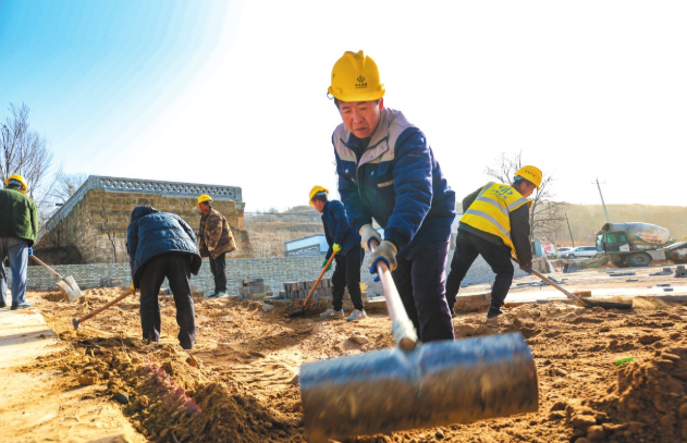 陽(yáng)面村的工人正在鋪設(shè)鄉(xiāng)村驛站廣場(chǎng)的地面。