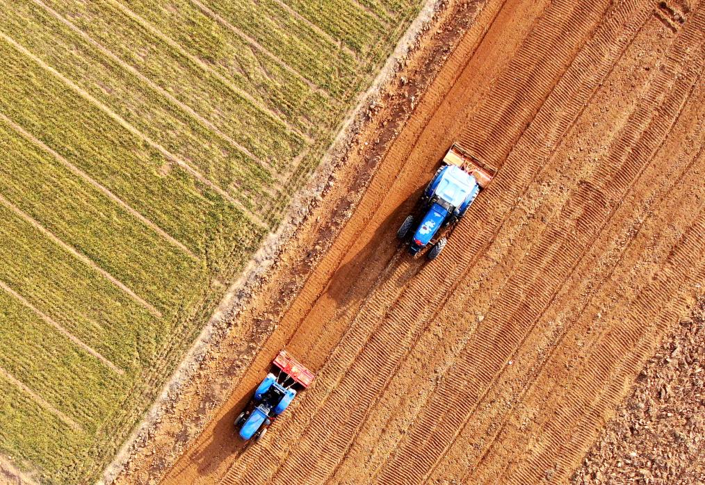 2月18日,山東省臨沂市平邑縣平邑街道農(nóng)民駕駛農(nóng)機在翻耕土地(無人機照片)。新華社發(fā)(武紀全 攝)