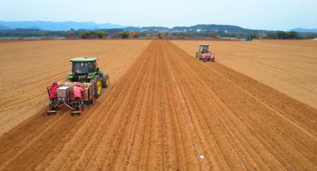 在廣西來賓市興賓區(qū)鳳凰鎮(zhèn)國家現(xiàn)代農(nóng)業(yè)產(chǎn)業(yè)園黃安優(yōu)質(zhì)“雙高”糖料蔗基地,田間地頭大型拖拉機、甘蔗種植機并列同步作業(yè),不到15分鐘,兩壟長約200米的甘蔗全部種植完畢。