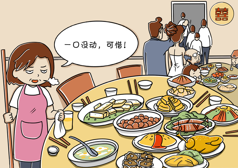 杜絕“剩宴”需要社會合力。結(jié)婚“剩宴”并不是短時間形成的,也不是個別現(xiàn)象,因此,根治這種陋習(xí)、在全社會培養(yǎng)節(jié)約意識和節(jié)儉習(xí)慣是一項長期任務(wù),也是一項全民行動,需要社會各界多元化、多角度共同推進(jìn)。比如,黨員干部以身作則,率先垂范;餐飲行業(yè)增強(qiáng)節(jié)約意識,改進(jìn)服務(wù),合理優(yōu)化供應(yīng)標(biāo)準(zhǔn)。只有人人轉(zhuǎn)變觀念,共同做厲行節(jié)約、反對浪費的踐行者、宣傳者和監(jiān)督者,才能帶動形成良好社會風(fēng)氣。(文字:馬若虎 漫畫:甘甜)