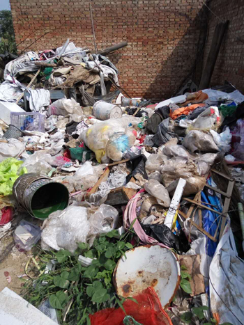 8月2日上午,在村民的陪同下來到匡村村南,在忻州烈士陵園背后一個叫周家(音)墳的地方,看到路口黑色的玉米桿躺放在井蓋上,生銹的用鋼管焊成的院門兩邊和門口,堆放著五顏六色的塑料袋以及廢塑料和破鐵桶等生活垃圾破爛,連院內(nèi)也同樣是垃圾。
