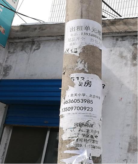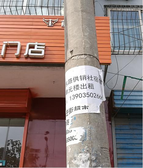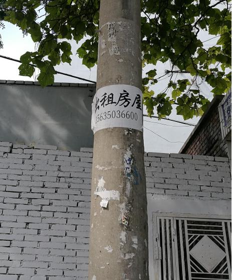健康街南巷九龍苑小區(qū)附近電線桿出租房小廣告(吳瓊 攝)