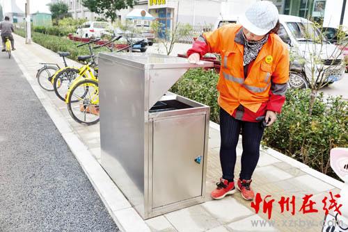記者從市環(huán)衛(wèi)處了解到,為提高環(huán)境衛(wèi)生管理水平,美化城區(qū)環(huán)境,市環(huán)衛(wèi)處將在城區(qū)部分新修、新改建的主次干道兩旁、家屬院門口及部分服務單位,分批次更換220個新型垃圾桶。目前新增配更換的垃圾桶主要集中在長征街、團結街、利民街等新修路段。圖為環(huán)衛(wèi)工人正在對垃圾桶進行維護。(張志遠攝)