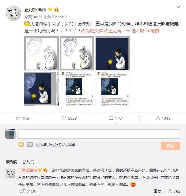 關(guān)于這張畫上的佛像到底是不是地藏菩薩,網(wǎng)友各說(shuō)各話直到現(xiàn)在還有人在糾結(jié)。而其實(shí),插畫的原創(chuàng)作者@正月插畫師早在今天凌晨00:31分就已經(jīng)作出說(shuō)明:畫的只是一個(gè)夜晚在燈前念經(jīng)的古人,佛像照釋迦摩尼所畫,不出自任何典故也沒(méi)有任何寓意!