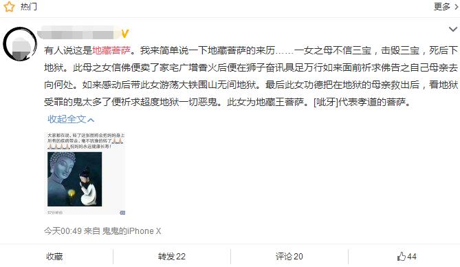 還有網(wǎng)友翻出了《地藏本愿經(jīng)》的解釋斷定這是一張地藏菩薩圖,代表孝道。