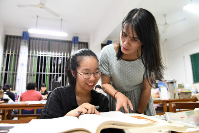 廣西都安縣高級(jí)中學(xué)老師韋喜鳳(右)在輔導(dǎo)學(xué)生功課(6月6日攝)。新華社記者 陸波岸 攝