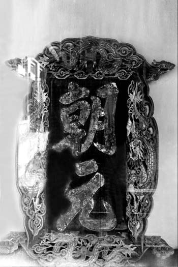 “朝元”金字藍地浮雕云龍邊大豎匾現存原件