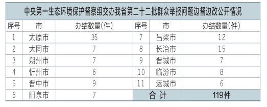 中央第一生態(tài)環(huán)境保護(hù)督察組交辦我省第二十二批群眾舉報問題119件,辦結(jié)119件。公示119件,其中太原市35件、大同市7件、朔州市7件、忻州市6件、晉中市9件、陽泉市7件、呂梁市12件、長治市15件、晉城市7件、臨汾市8件、運(yùn)城市6件??傻卿浬轿魇∪嗣裾W(wǎng)站或掃描二維碼查閱群眾信訪舉報轉(zhuǎn)辦和邊督邊改公開情況一覽表。