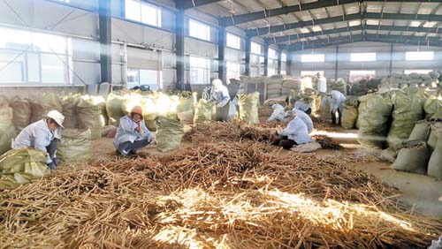 當?shù)剞r民在產業(yè)孵化園倉房內分揀黃芪藥材