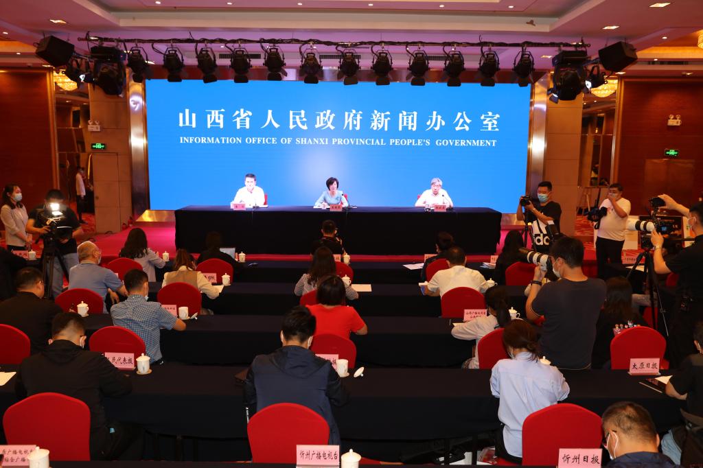 朱曉東介紹忻州市承辦大會相關(guān)情況,公布大會標識、海報和亮點活動,并回答記者提問。范濤攝