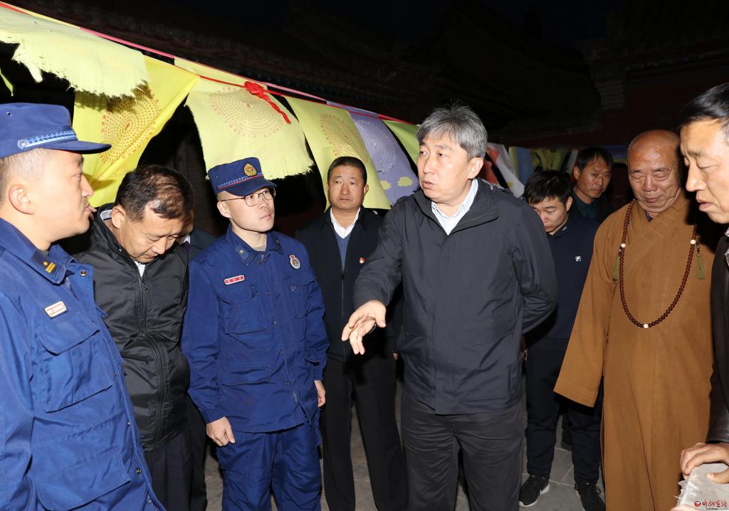 在尊勝寺。范濤 攝 秋冬季節(jié)天干物燥,森林防火消防安全進入關(guān)鍵階段。朱曉東沿途察看作物秸稈收儲情況,專門到國保單位佛光寺、尊勝寺檢查消防安全工作,赴五臺縣應急救援訓練基地檢查森林消防應急演練情況。他強調(diào),各級各部門要切實明確消防安全管理人和責任人,各單位特別是防火重點單位不僅要配齊配全各類消防器材,而且要確保管用能用。對巡查發(fā)現(xiàn)的消防隱患要及時消除,切實防患于未然。要加大宣傳力度,讓森林防火期嚴禁野外用火規(guī)定深入人心,切實轉(zhuǎn)變?yōu)槿罕姷淖杂X意識。要加強應急隊伍實地演練,全面提升發(fā)現(xiàn)、處置和快速反應出動的綜合應急能力。 其間,朱曉東還檢查了五臺縣城瀛湖公園三期建筑工程安全生產(chǎn)情況。 (責任編輯:盧相?。?/span> |