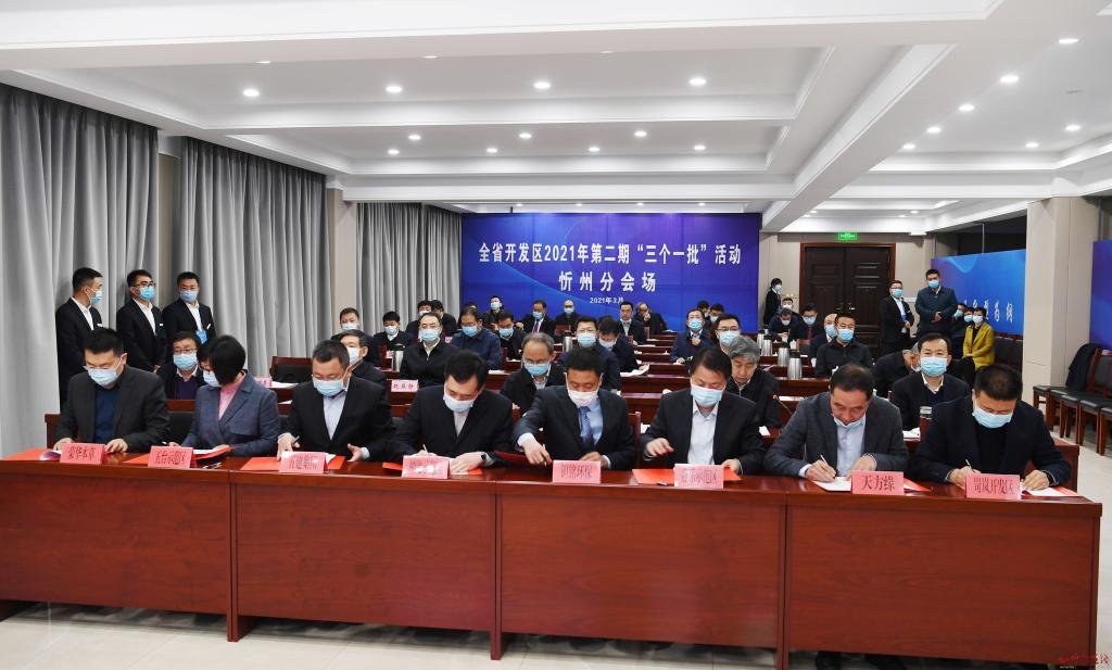 與全省活動(dòng)同步,忻州分會(huì)場(chǎng)舉行了項(xiàng)目集中簽約儀式。在鄭連生、朱曉東等與會(huì)人員的共同見證下,忻州經(jīng)濟(jì)開發(fā)區(qū)新型高端建筑裝飾材料生產(chǎn)及倉(cāng)儲(chǔ)物流基地項(xiàng)目、原平經(jīng)濟(jì)技術(shù)開發(fā)區(qū)年產(chǎn)2.5萬(wàn)噸建筑配套輔材項(xiàng)目、繁峙經(jīng)濟(jì)技術(shù)開發(fā)區(qū)新建300MW光伏發(fā)電項(xiàng)目、定襄經(jīng)濟(jì)技術(shù)開發(fā)區(qū)基于5G+云平臺(tái)風(fēng)力發(fā)電環(huán)鍛件智能制造擴(kuò)建項(xiàng)目、岢嵐經(jīng)濟(jì)技術(shù)開發(fā)區(qū)玻璃棉生產(chǎn)項(xiàng)目、靜樂(lè)現(xiàn)代農(nóng)業(yè)產(chǎn)業(yè)示范區(qū)杜家村鎮(zhèn)集中供熱熱源廠建設(shè)工程特許經(jīng)營(yíng)BOT項(xiàng)目、神池現(xiàn)代農(nóng)業(yè)產(chǎn)業(yè)示范區(qū)基礎(chǔ)設(shè)施及標(biāo)準(zhǔn)廠房建設(shè)PPP項(xiàng)目、五臺(tái)現(xiàn)代農(nóng)業(yè)產(chǎn)業(yè)示范區(qū)臺(tái)黨參種植及加工項(xiàng)目8個(gè)代表性項(xiàng)目分兩批進(jìn)行簽約。