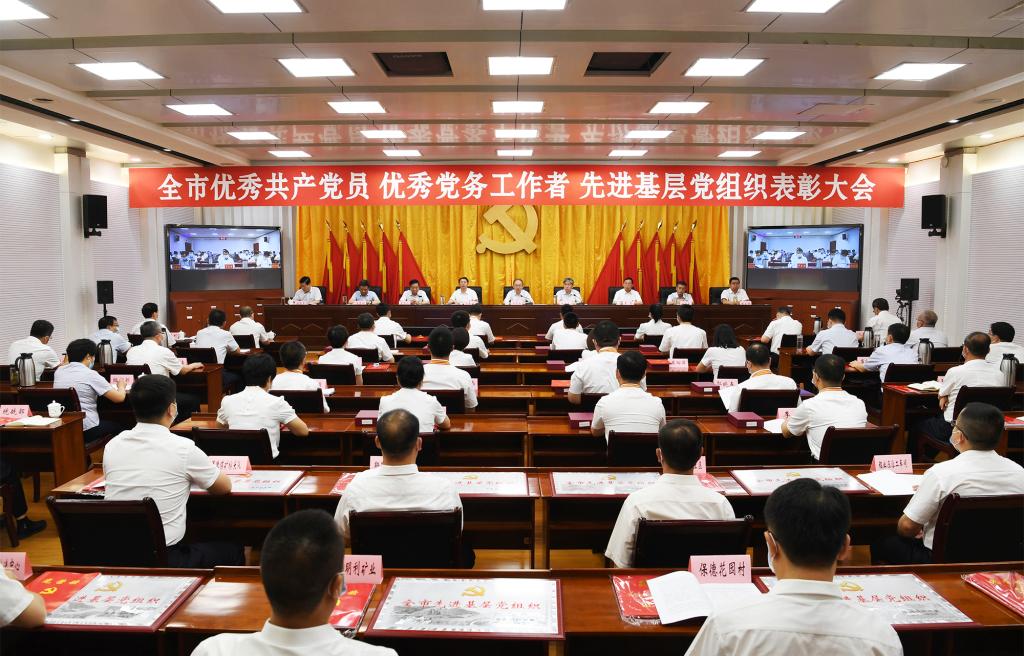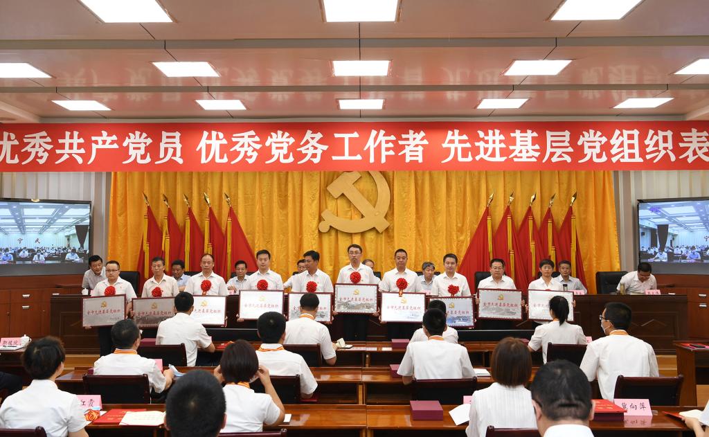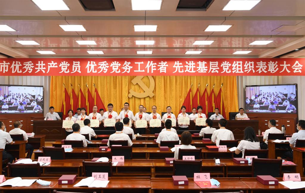 上午8時(shí)30分,大會(huì)正式開始,全體起立,奏唱國歌。來自全市各行各業(yè)、在工作中取得優(yōu)異成績的99名共產(chǎn)黨員、100名黨務(wù)工作者和100個(gè)基層黨組織,分別被授予“全市優(yōu)秀共產(chǎn)黨員”“全市優(yōu)秀黨務(wù)工作者”“全市先進(jìn)基層黨組織”榮譽(yù)稱號(hào)。受到表彰的優(yōu)秀個(gè)人和先進(jìn)集體代表先后上臺(tái)領(lǐng)獎(jiǎng),會(huì)場(chǎng)響起熱烈掌聲。