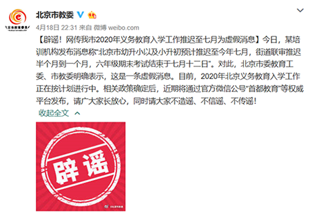 真相:北京市委教育工委、市教委明確表示,這是一條虛假消息。目前,2020年北京義務(wù)教育入學(xué)工作正在按計劃進(jìn)行中。相關(guān)政策確定后,近期將通過官方微信公號“首都教育”等權(quán)威平臺發(fā)布。