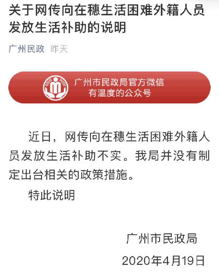 真相:廣州市民政局19日發(fā)表說明:近日,網(wǎng)傳向在穗生活困難外籍人員發(fā)放生活補(bǔ)助不實。我局并沒有制定出臺相關(guān)的政策措施。