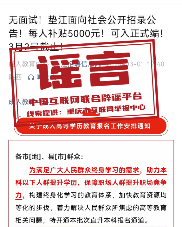 真相:近日,“墊江招聘信息網(wǎng)”微信公眾號發(fā)布信息:“無面試!重慶墊江面向社會公開招錄公告!每人補貼5000元!可入正式編!”部分網(wǎng)民看到該信息后誤認為,墊江面向社會以補貼形式招錄具有正式編制的公務人員,于是紛紛向墊江縣有關部門致電咨詢招錄情況。經(jīng)核實,近年來,墊江未曾以補貼方式和不經(jīng)過面試招錄具有正式編制公務人員。該信息實則為成人學歷提升培訓信息,而非正式編制公務人員招錄信息。墊江縣互聯(lián)網(wǎng)信息辦公室已依法對發(fā)布該信息的微信公眾號負責人進行約談和教育批評,指出虛假信息的危害性,并責令刪除相關信息。(來源:重慶辟謠)