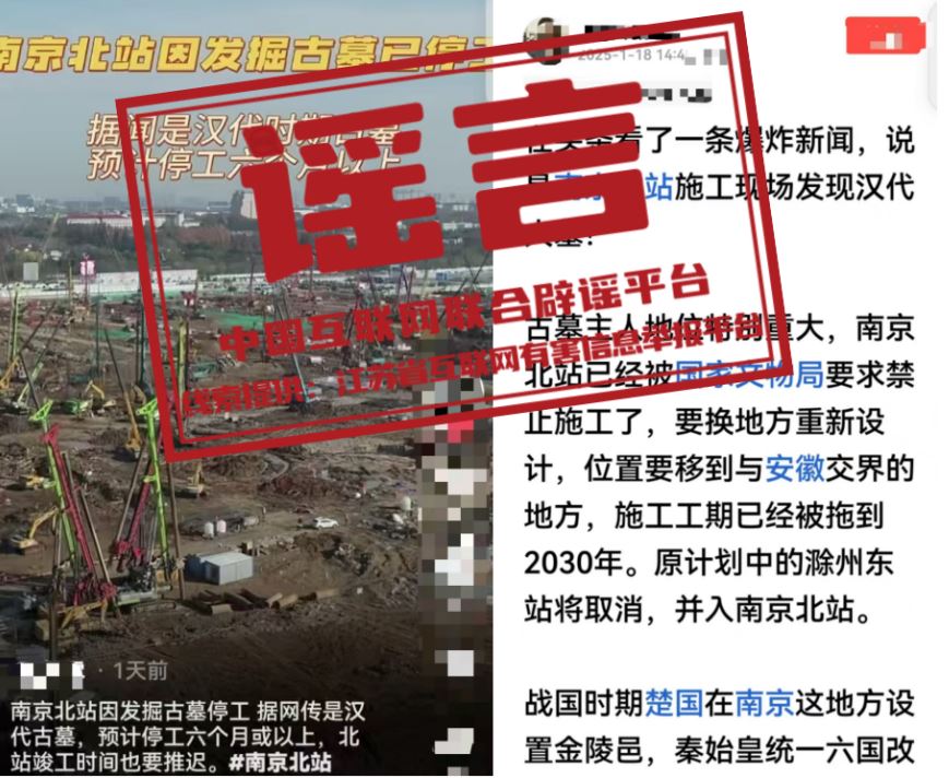 真相:近日,有網(wǎng)民在網(wǎng)絡(luò)平臺(tái)發(fā)帖稱,南京北站因挖到古墓,“已經(jīng)被國(guó)家文物局要求禁止施工了”“預(yù)計(jì)停工六個(gè)月或以上”“施工工期已經(jīng)被拖到2030年”等。經(jīng)江蘇省互聯(lián)網(wǎng)辟謠平臺(tái)與省文物部門(mén)和屬地核實(shí),目前沒(méi)有收到國(guó)家文物局關(guān)于“南京北站禁止施工”的有關(guān)通知,南京北站除個(gè)別涉及考古發(fā)掘作業(yè)區(qū)域外,其他施工作業(yè)均按計(jì)劃正常有序推進(jìn),網(wǎng)傳信息系謠言。(來(lái)源:江蘇省互聯(lián)網(wǎng)辟謠平臺(tái)、“南京網(wǎng)絡(luò)辟謠”微信公眾號(hào))