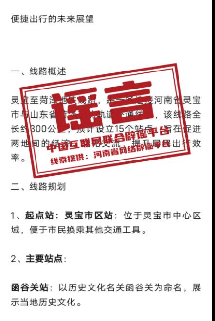 真相:近日,有自媒體賬號在互聯(lián)網(wǎng)平臺發(fā)布“靈寶到菏澤的地鐵”相關信息,稱“該線路全長約300公里,預計設立15個站點”“起點站為靈寶市區(qū)站,位于靈寶市中心區(qū)域”,引發(fā)關注。經(jīng)核實,該消息系虛假信息?;ヂ?lián)網(wǎng)不是法外之地,請自覺遵守法律法規(guī),不造謠、不信謠、不傳謠。(來源:“清朗河南”微信公眾號、網(wǎng)信靈寶)