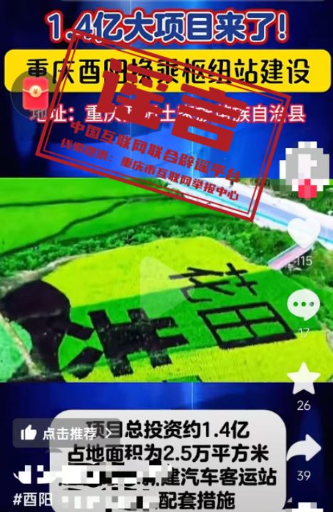 真相:近日,有網(wǎng)民發(fā)布信息稱“1.4億大項(xiàng)目來了,重慶酉陽(yáng)換乘樞紐站建設(shè),新建汽車客運(yùn)站及相關(guān)配套”,引發(fā)關(guān)注。經(jīng)重慶市酉陽(yáng)縣交通運(yùn)輸委核實(shí),酉陽(yáng)縣正在推進(jìn)桃花源景區(qū)游客集散中心提升項(xiàng)目,暫無“1.4億建設(shè)換乘樞紐站”項(xiàng)目,網(wǎng)傳信息系謠言。(來源:“重慶辟謠”微信公眾號(hào))