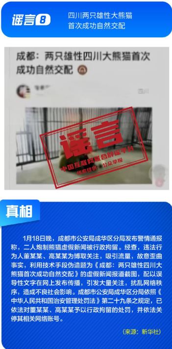 ??針對(duì)各類網(wǎng)絡(luò)謠言與亂象,多部門開(kāi)展協(xié)同治理,聯(lián)動(dòng)整治。1月16日,中央網(wǎng)信辦召開(kāi)全國(guó)網(wǎng)絡(luò)辟謠聯(lián)動(dòng)機(jī)制第三次全體會(huì)議,部署以辟謠工作新成效助力清朗網(wǎng)絡(luò)空間建設(shè)。中央網(wǎng)信辦聯(lián)合工業(yè)和信息化部等部門持續(xù)整治汽車行業(yè)網(wǎng)絡(luò)亂象,處置一批涉嫌挑動(dòng)對(duì)立、炒作負(fù)面話題、違規(guī)測(cè)評(píng)的賬號(hào);國(guó)家廣播電視總局開(kāi)展“AI魔改”視頻專項(xiàng)治理,各平臺(tái)處置大量違規(guī)內(nèi)容。各地網(wǎng)信部門積極行動(dòng),陜西西安深入開(kāi)展房地產(chǎn)領(lǐng)域網(wǎng)絡(luò)專項(xiàng)行動(dòng),處置散布樓市謠言的房產(chǎn)中介賬號(hào),四川成都依法處置30余個(gè)惡意關(guān)聯(lián)地域、污名化城市的違規(guī)賬號(hào)。公安機(jī)關(guān)依法打擊造謠傳謠人員。擺拍“小女孩在學(xué)校跳蚤市場(chǎng)用50元淘到名酒”、利用AI偽造“假救護(hù)車非法轉(zhuǎn)運(yùn)”、編造“兩只雄性四川大熊貓首次成功自然交配”等謠言的相關(guān)責(zé)任人已依法被予以行政處罰。