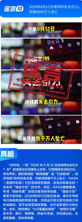 ??健康與科普領(lǐng)域謠言違背客觀規(guī)律?!叭搜椎鞍资恰黾用庖吡Α姆▽殹笨桃饪浯笤撎幏剿幍呐R床用途,忽略其特定醫(yī)療場(chǎng)景與使用風(fēng)險(xiǎn);所謂“大棚草莓、冷庫(kù)葡萄、進(jìn)口車?yán)遄?、染色砂糖橘是冬天水果界四大毒王”謠言片面解讀農(nóng)產(chǎn)品種植與保鮮方式,缺乏科學(xué)依據(jù);“四川兩只雄性大熊貓首次成功自然交配”純屬為吸引流量而捏造的獵奇內(nèi)容,其視頻畫面為AI生成;“2026年8月12日地球?qū)⑹ヒ?,?dǎo)致6000萬(wàn)人死亡”更是無(wú)中生有的荒謬謠言。