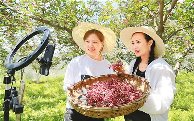 今年,甘肅省隴南市武都區(qū)的百萬畝花椒喜獲豐收,隴南市相關(guān)部門及時組織本土電商人才深入田間地頭,通過電商平臺和直播帶貨方式助農(nóng)銷售。圖為日前,網(wǎng)絡(luò)主播在武都區(qū)郭河鄉(xiāng)候家彎村利用智能手機直播推介花椒。李旭春攝(人民視覺)
