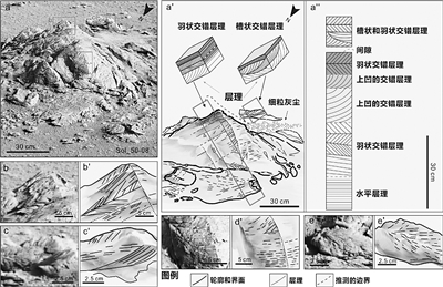 研究團隊發(fā)現(xiàn),祝融段內(nèi)的巖石通常保留有局部呈透鏡狀的交錯層理組構(gòu),以多種小型交錯層理為主,伴隨少量透鏡狀壓扁層理和小型水道結(jié)構(gòu)的沉積構(gòu)造。其中,組成交錯層理的層系在兩個相反的方向疊覆傾斜,指示雙向古水流環(huán)境。