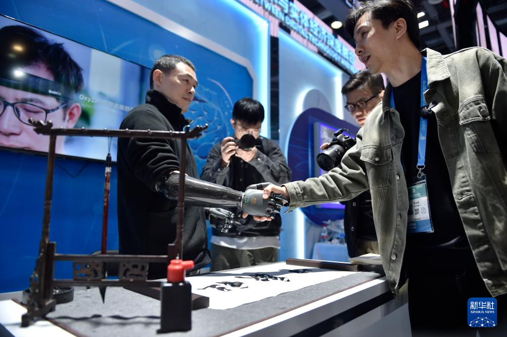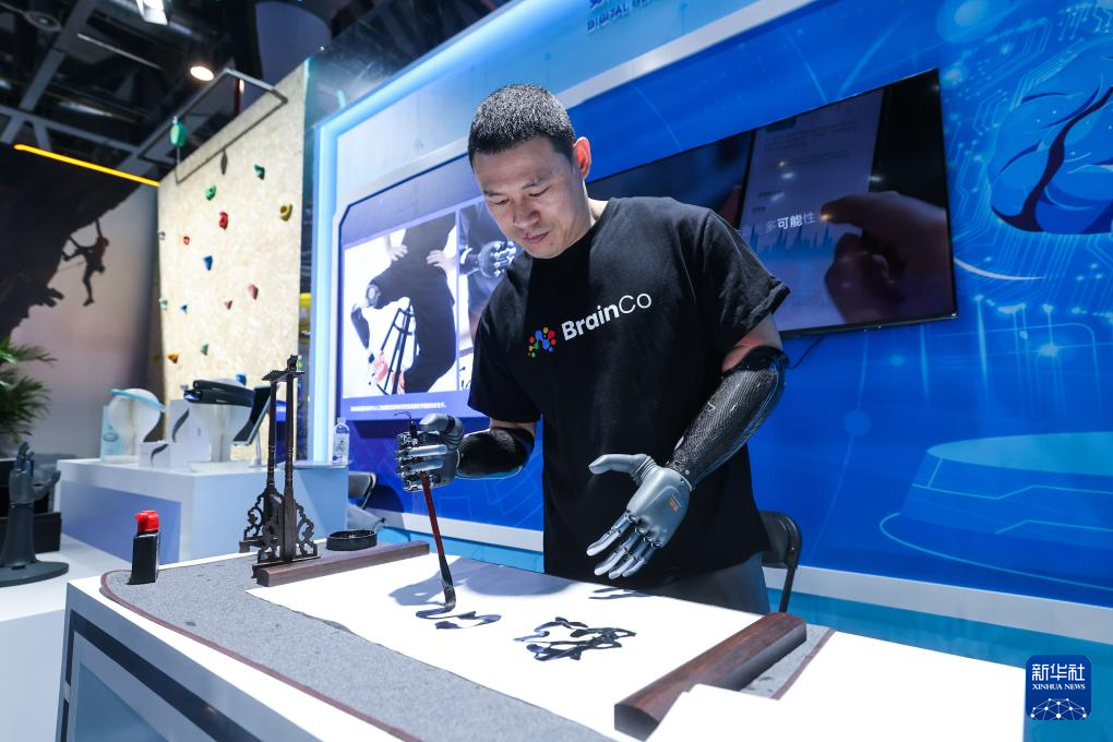 在展位現(xiàn)場,另一名上肢截肢的人士在使用強腦科技推出的智能仿生手。這也是基于非侵入式腦機接口技術(shù)的產(chǎn)品。使用者利用智能仿生手不但可輕松取物,還能寫毛筆字。