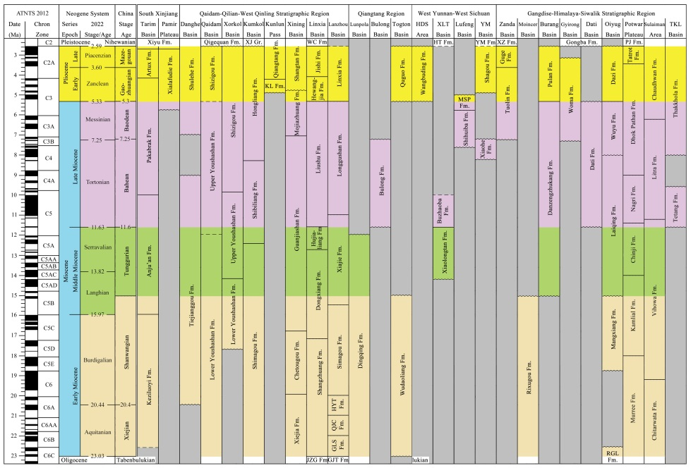 中國的新近紀(jì)年代地層系統(tǒng)分為中新統(tǒng)的謝家階、山旺階、通古爾階、灞河階、保德階5個階,以及上新統(tǒng)的高莊階和麻則溝階2個階。研究提出,在青藏高原新生代陸相地層的劃分對比和測年標(biāo)定上,哺乳動物化石起到非常重要的作用。