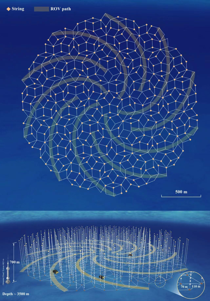 根據(jù)設(shè)計(jì),這些線纜像巨型海藻一樣垂直地錨定于海床上,每根長(zhǎng)約700米,互相間距70米至110米。每根線纜搭載約20個(gè)光學(xué)探測(cè)球艙,如同深海中的一串串鈴鐺,靜待高能中微子的到來。