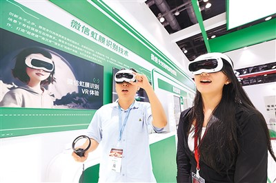 隨著數(shù)字金融領(lǐng)域創(chuàng)新成果不斷投入應(yīng)用,刷掌支付、虹膜識(shí)別支付等支付手段逐步走進(jìn)居民生活。圖為觀眾在2024中國(guó)國(guó)際金融展上通過虛擬現(xiàn)實(shí)設(shè)備體驗(yàn)微信虹膜識(shí)別技術(shù)。陳曉根攝(人民視覺)