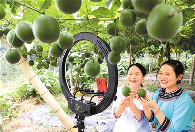 互聯(lián)網(wǎng)平臺(tái)互聯(lián)互通,將為電子商務(wù)從業(yè)者和消費(fèi)者帶來更多便利。圖為日前,在貴州省黔東南苗族侗族自治州榕江縣仁里水族鄉(xiāng)通倒村羅漢果種植基地,工作人員在直播推介當(dāng)?shù)爻霎a(chǎn)的羅漢果。李長(zhǎng)華攝(人民視覺)