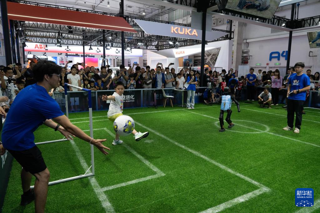 8月8日,觀眾在2025世界機(jī)器人大會(huì)上與機(jī)器人踢足球。新華社記者 謝晗 攝