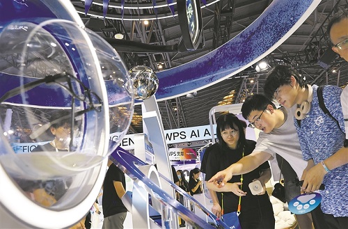 參觀者在2025世界人工智能大會(huì)現(xiàn)場的一個(gè)智能眼鏡展臺(tái)前交流討論。新華社記者 方喆攝