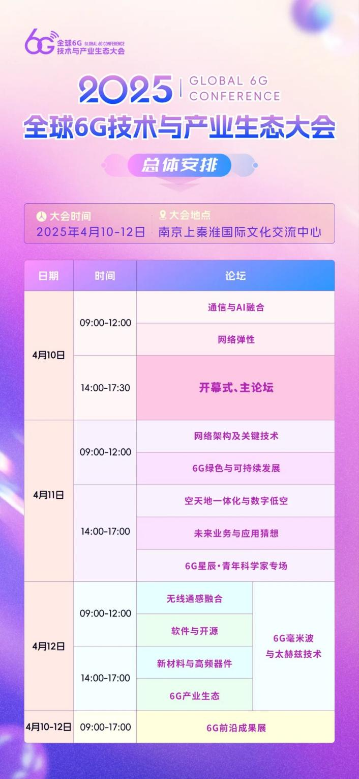 4月10日至12日,由未來移動通信論壇、紫金山實驗室主辦的2025全球6G技術(shù)與產(chǎn)業(yè)生態(tài)大會(原全球6G技術(shù)大會)將在南京上秦淮國際文化交流中心召開。本次大會以“共筑創(chuàng)新 同享未來”為主題,來自全球的6G領(lǐng)域的思想領(lǐng)袖、技術(shù)先鋒和產(chǎn)業(yè)領(lǐng)軍人物將再次齊聚金陵,共同探討6G技術(shù)創(chuàng)新與未來產(chǎn)業(yè)生態(tài)的發(fā)展藍圖。