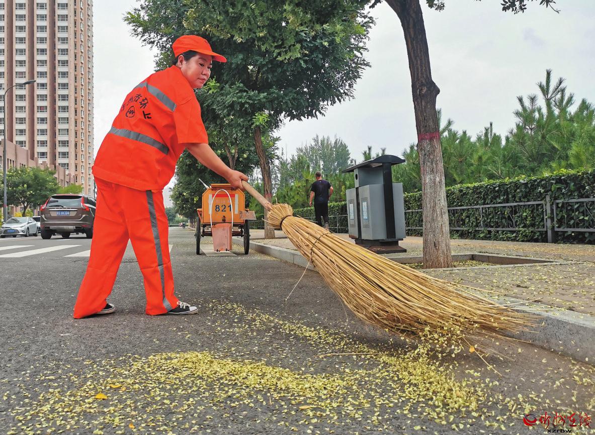 郭彩云在打掃落葉。張存良 攝