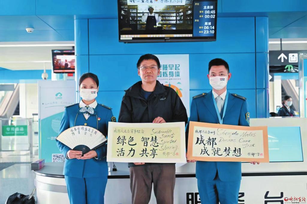 成都大運(yùn)會期間一爾(中)的書法作品被地鐵志愿者服務(wù)站收藏