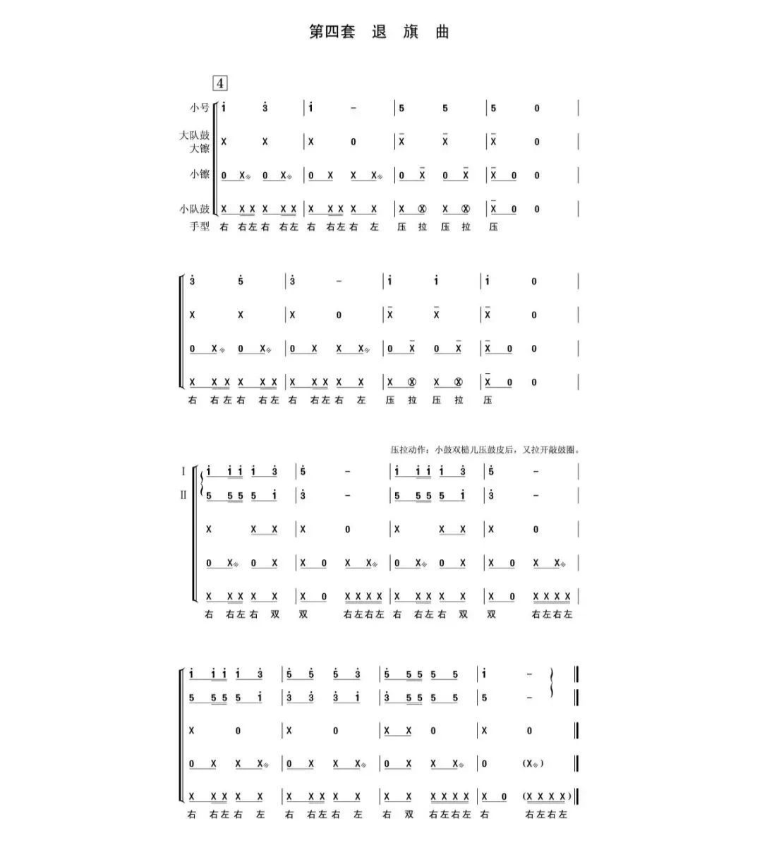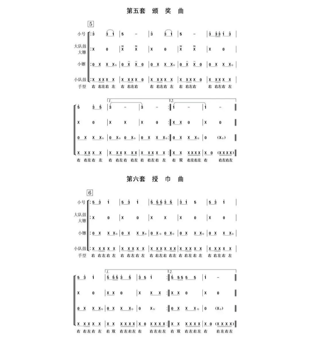 少先隊鼓號隊總譜除間奏鼓外共10套曲目,包括:開場曲、進(jìn)行曲、出旗曲、退旗曲、頒獎曲、授巾曲、檢閱曲、宣誓曲、迎賓曲、歡送曲。