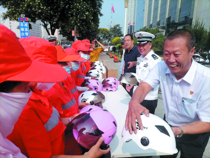 今年是我市創(chuàng)建全國文明城市的決戰(zhàn)決勝年,廣大環(huán)衛(wèi)工人一直默默奮斗在崗位上,為我市創(chuàng)文不斷努力。市公安局交警支隊(duì)始終牽掛著奮戰(zhàn)在基層一線的環(huán)衛(wèi)工人,支隊(duì)以此次贈(zèng)送頭盔活動(dòng)為契機(jī),持續(xù)關(guān)心關(guān)愛環(huán)衛(wèi)工人的生命安全和身體健康。市公安局交警支隊(duì)負(fù)責(zé)人表示:“環(huán)衛(wèi)工人大多騎著電動(dòng)三輪車或人力保潔車穿梭在大街小巷,機(jī)動(dòng)車道是他們的主要作業(yè)區(qū)之一,佩戴安全頭盔,可以大大增加他們的安全系數(shù)。同時(shí),環(huán)衛(wèi)等重點(diǎn)行業(yè)的示范引領(lǐng)作用,將有力帶動(dòng)市民遵紀(jì)守法、安全出行,為文明城市創(chuàng)建打造一道亮麗的風(fēng)景線?!眻D為捐贈(zèng)活動(dòng)現(xiàn)場。張志遠(yuǎn) 攝影報(bào)道