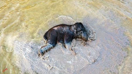 象群飽餐一頓,到了玩耍時(shí)間。它們轉(zhuǎn)到一個(gè)魚(yú)塘邊,幾頭野象滑到魚(yú)塘里“洗澡”,在水里不停翻滾,嚇得魚(yú)兒都跳出了水面。在岸上,有的野象把水桶踢著玩,還有的爭(zhēng)搶水管當(dāng)玩具……