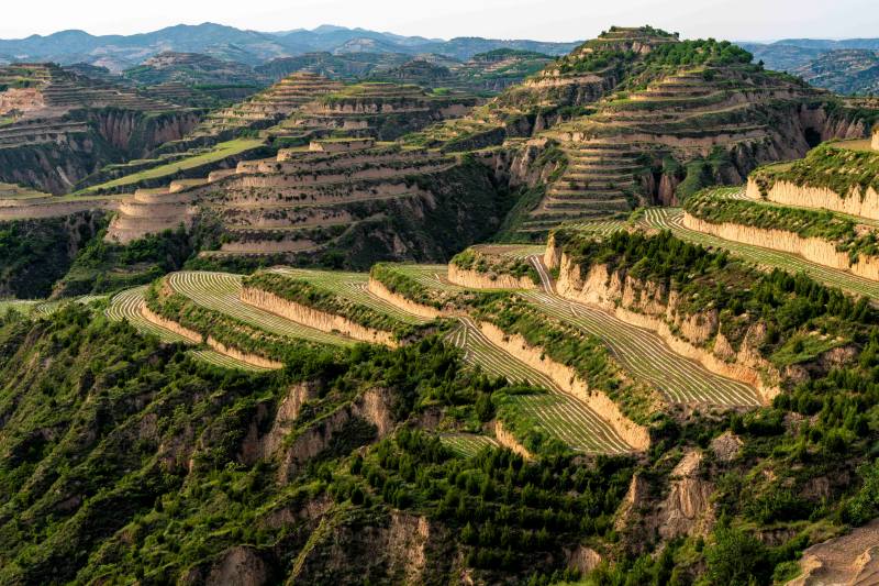 站在永和梯田觀景臺(tái)上,一壟壟地膜像一條條白色的絲帶,纏繞在層層疊疊的梯田間。連綿的山坡間、山塬上,鋪滿了綠色的盛裝——油松、連翹,還有地里的高粱苗,正孕育著無(wú)限的生機(jī)活力。